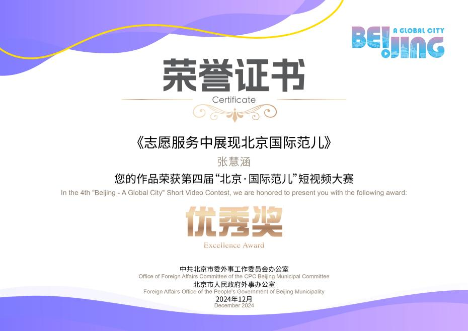 近日,由北京市委外事工作委员会和北京市人民政府外办举办的第四届“北京·国际范儿”短视频大赛颁奖仪式在中国电影博物馆举行。yl23455永利集团张慧涵同学凭借短视频作品“志愿服务中展现北京国际范儿”,荣获大赛“优秀奖”。