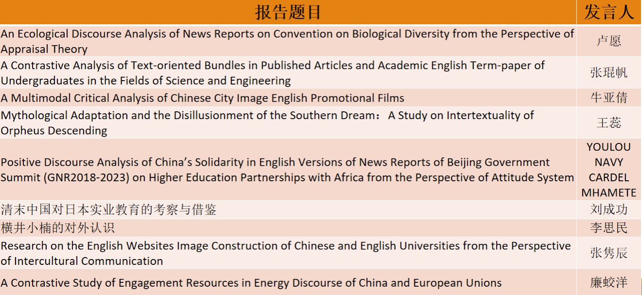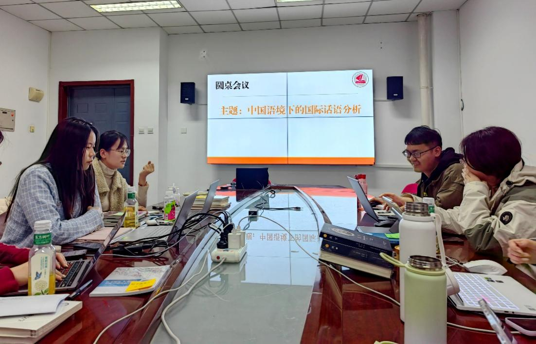 在圆桌会议环节,7名研一同学以“中国语境下的国际话语分析”为主题开展了热烈讨论。他们关注国内外社会的发展动态,聚焦习近平总书记在国际会议上的重要讲话、社交媒体话语、课堂话语等语料,运用多种话语分析理论,为会后完成新一篇高水平科研论文明确了方向。