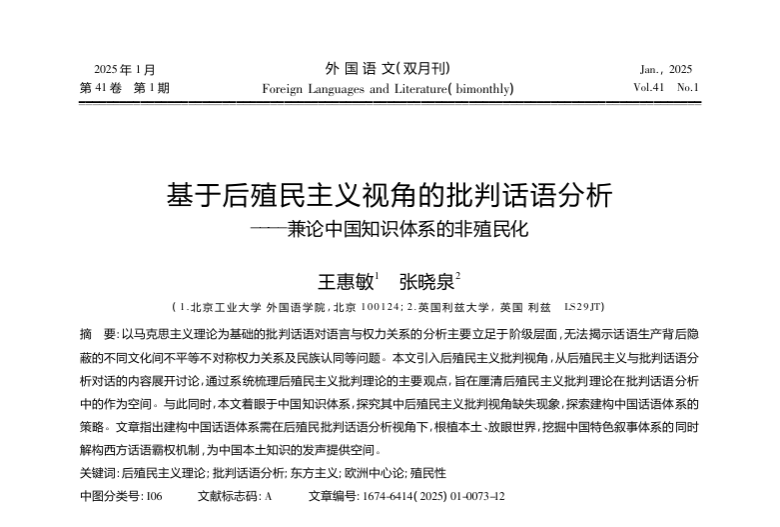 王惠敏博士在国内北大中文核心收录期刊《外国语文》发表题为“基于后殖民主义视角的批判话语分析-兼论中国知识体系的非殖民化”的研究论文。该研究引入后殖民主义批判视角,阐明了后殖民主义批判理论在批判话语分析范式中的可能作用与实践空间。同时该研究关注中国知识体系内部后殖民主义批判视角缺失现象,探索了构建中国话语体系的策略,为中国本土知识的发声提供了空间。