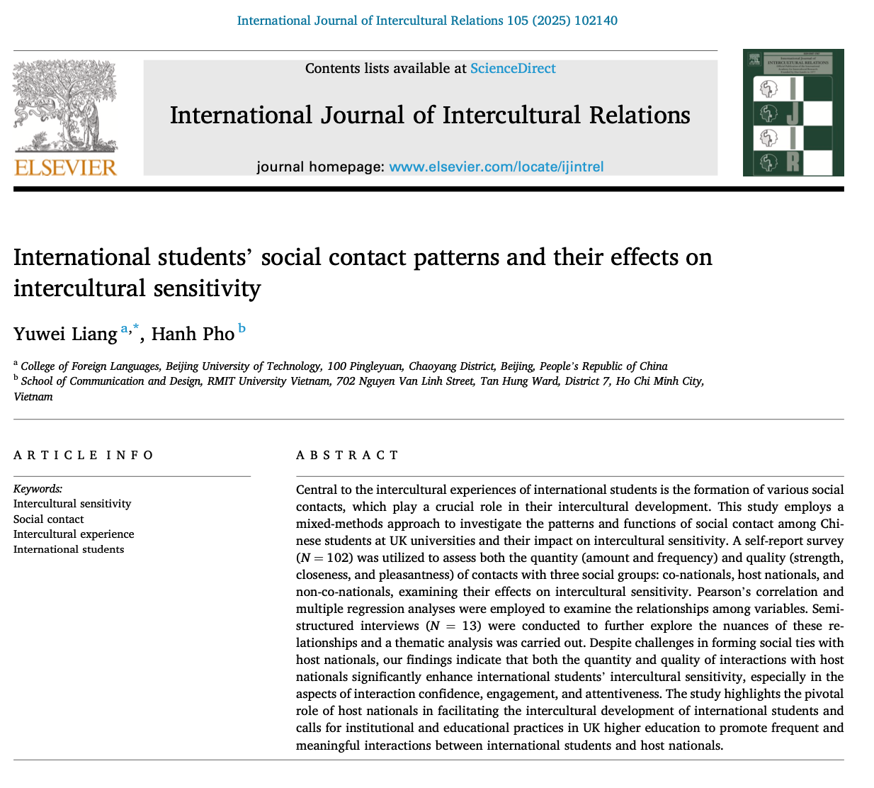 梁禹薇博士在国际权威SSCI收录期刊JCR一区期刊International Journal of Intercultural Relations发表题为“International students’social contact patterns and their effects on intercultural sensitivity”的研究论文。该研究以在英国留学的中国员工为对象,采用混合研究方法,系统分析了他们与不同群体的社会接触模式及其对跨文化敏感性的影响,为促进高校“在地国际化”提供了实证依据。