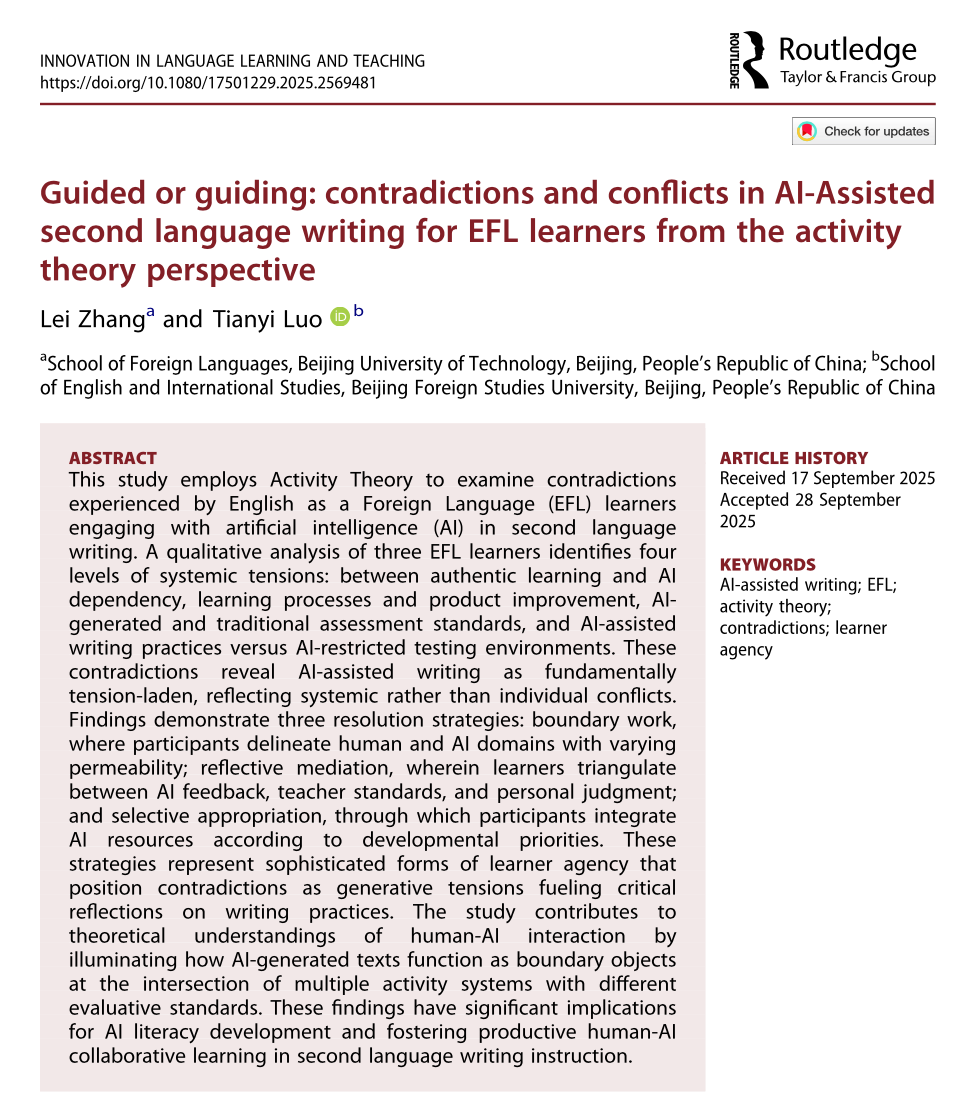 张蕾副教授在国际权威SSCI收录期刊JCR一区权威期刊Innovation in Language Learning and Teaching发表题为“Guided or guiding: contradictions and conflicts in AI-Assisted second language writing for EFL learners from the activity theory perspective”的研究论文。该研究从活动理论视角出发,探讨了人工智能辅助二语写作中“引导”与“被引导”之间的矛盾与张力,为AI技术在外语教学中的有效应用提供了新的理论视角与实践启示。