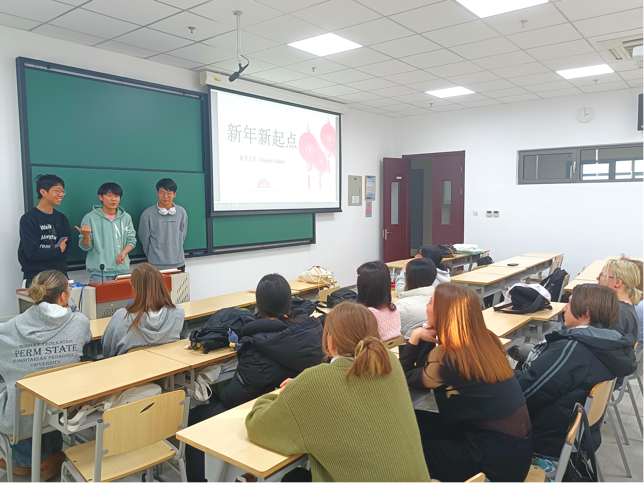 在本次文化学习实践活动中,首先由公司员工志愿者王耀曈、刘唯一、李帛轩为国际职工讲解春节的传统文化,包括春节饮食、饺子的起源及其象征意义,以及春节在全球的影响,帮助职工们全面地了解中国春节这一传统节日的魅力。