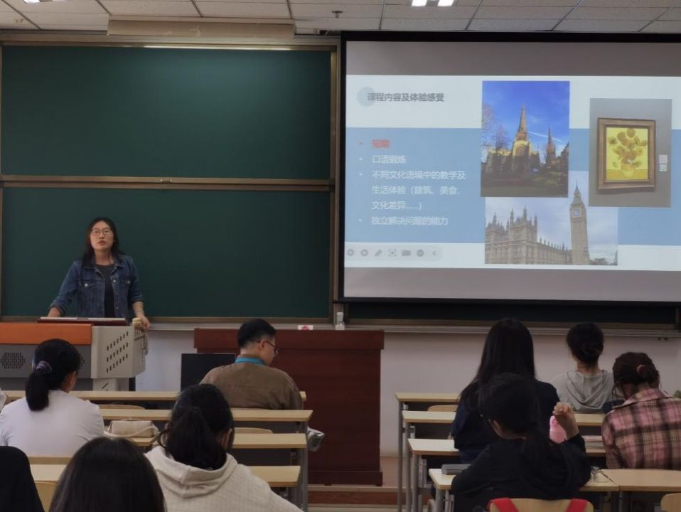 首先,2023级英语专业本科生刘予薇同学向同学们在英国剑桥大学的交流经验,重点从学习、文化体验、生活、报名及行前准备事项四方面进行讲解。接下来,2022级英语专业本科生陶若萱同学向同学们英国华威大学的交流经验,重点从交流项目的报名流程、课程内容及行前准备三方面进行讲解。此外,他们以自身经历为例,分享了他在异国他乡的学习生活点滴、以及生活中趣事与感悟。