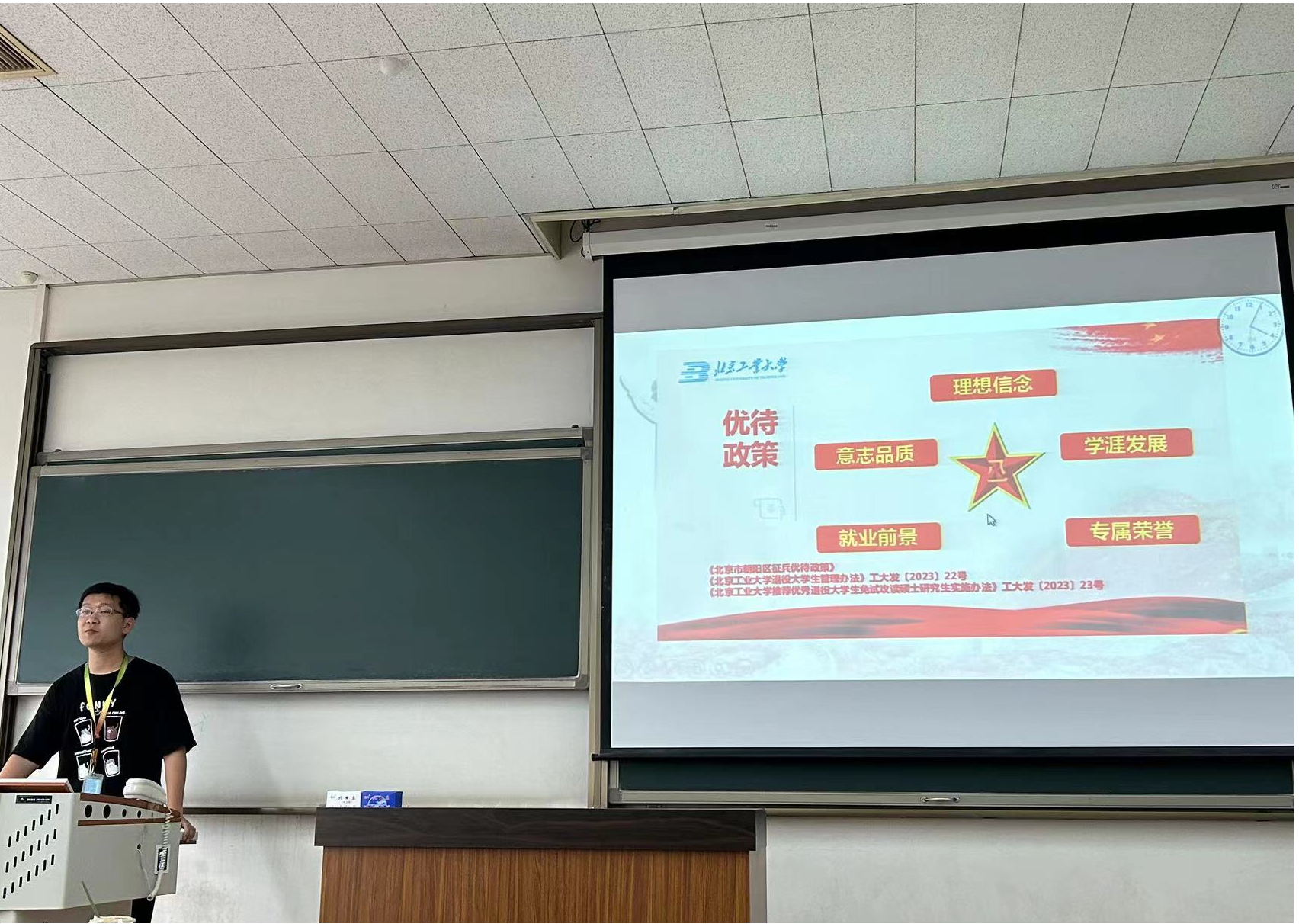 首先,郭兆欣向员工详细介绍了军训日程安排和军训纪律要求,叮嘱员工听从指挥,顺利完成军训任务。与此同时,他向大家介绍了最新征兵政策,鼓励大家携笔从戎、参军报国。针对2023级本科生,郭兆欣还为大家介绍了公司关于通州员工回迁本部宿舍的相关工作安排,提醒员工提前做好有关规划。